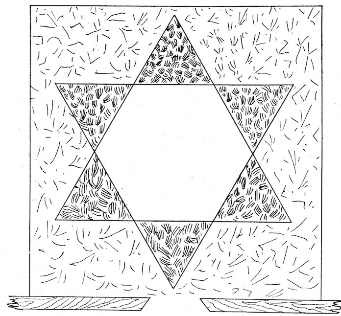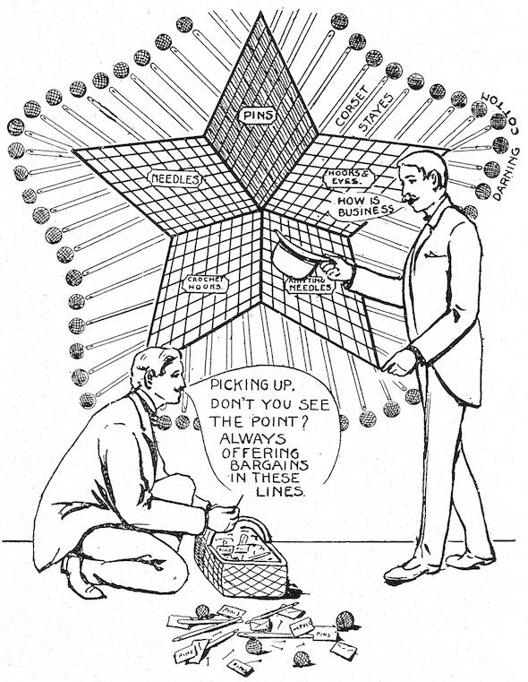 As a central figure for a notion display you may make a large star, divided into five diamonds, or points, as shown in the picture. These are each filled in with small notions, and the remainder of the background trimmed as you please. The central figure is the main point, and gives character to any trim, so that if you get the central idea the rest is easy. Two jointed, or, better yet, flexible forms are needed for this window. One is stooping down and picking up small notions and placing them in a basket. The other form bears a mouth card, reading, “How is business?” The stooping form replies, by a similar mouth card, “Picking up,” etc.
