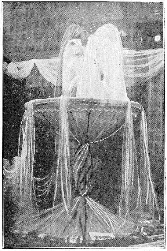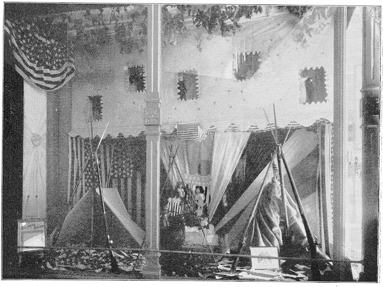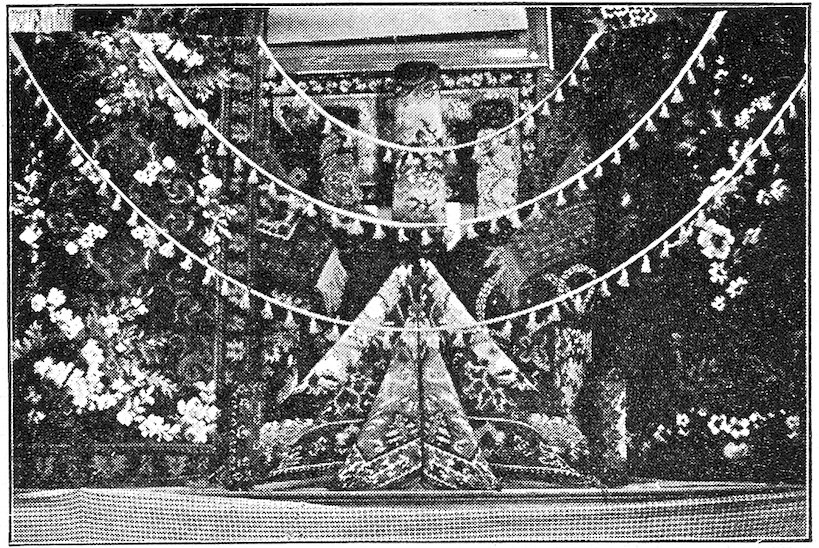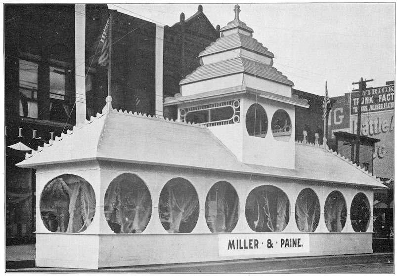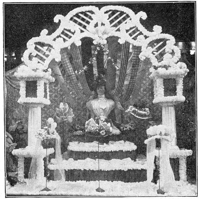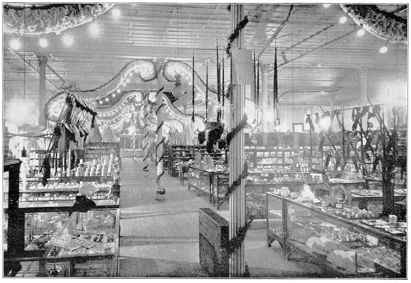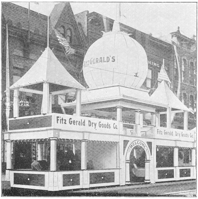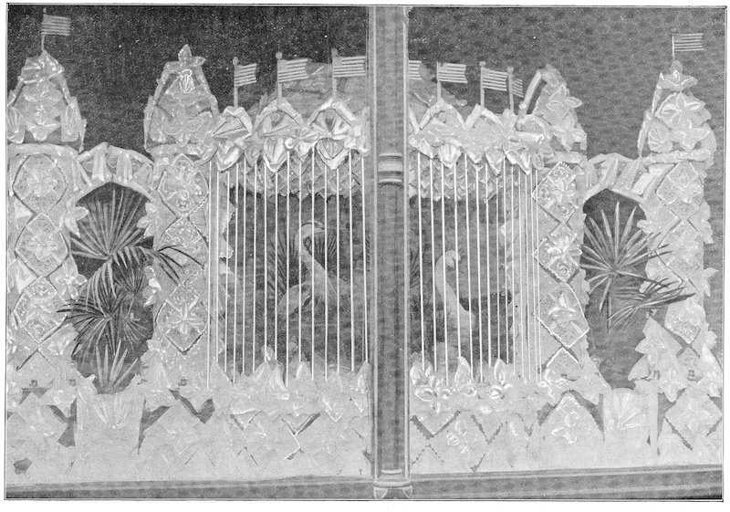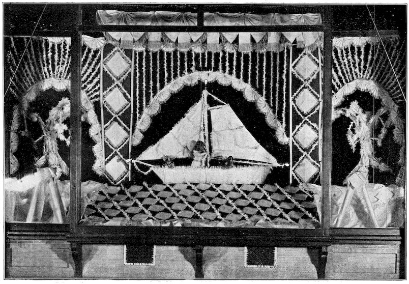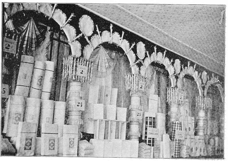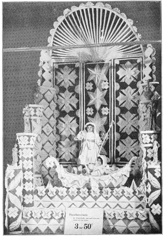 HANDKERCHIEF DISPLAY. FRONT GROUPS ARE UPON POLES, HAVING ELECTRIC LIGHT ON EACH POLE, SURMOUNTED BY WIRE CIRCLE TRIMMED WITH HANDKERCHIEFS.—Cartwright.