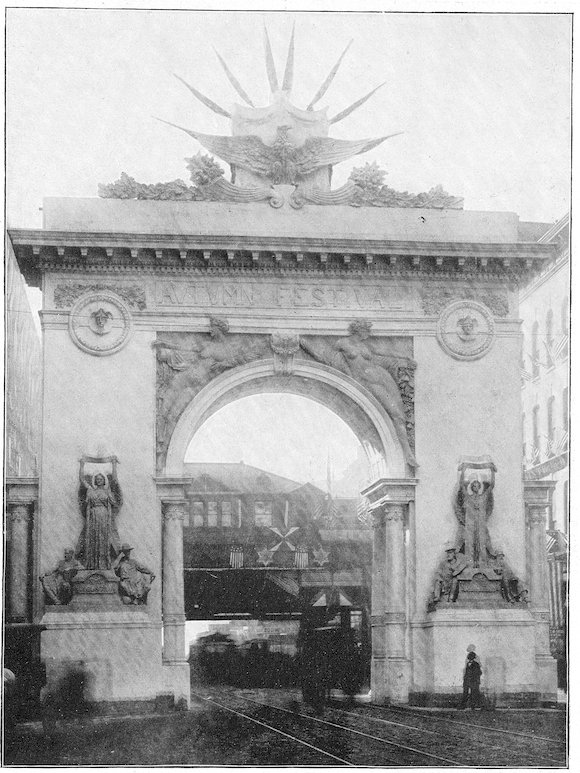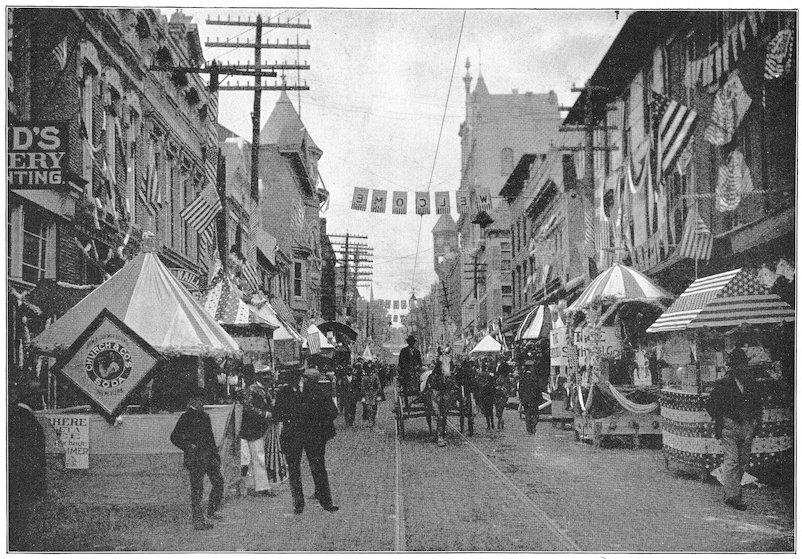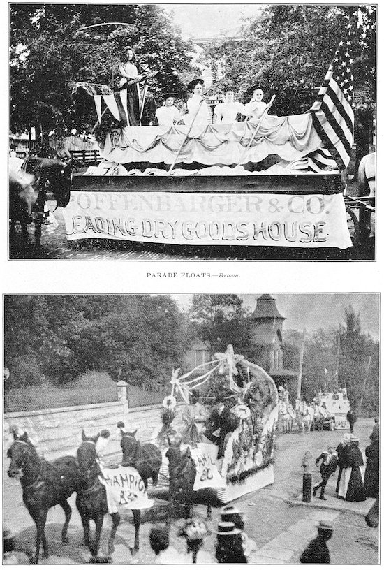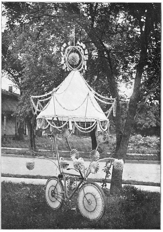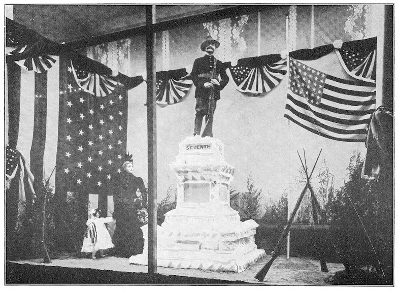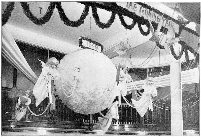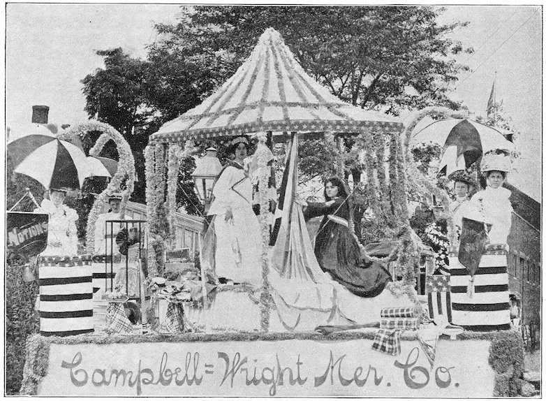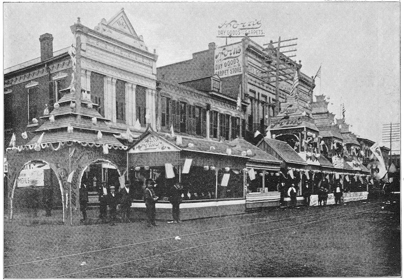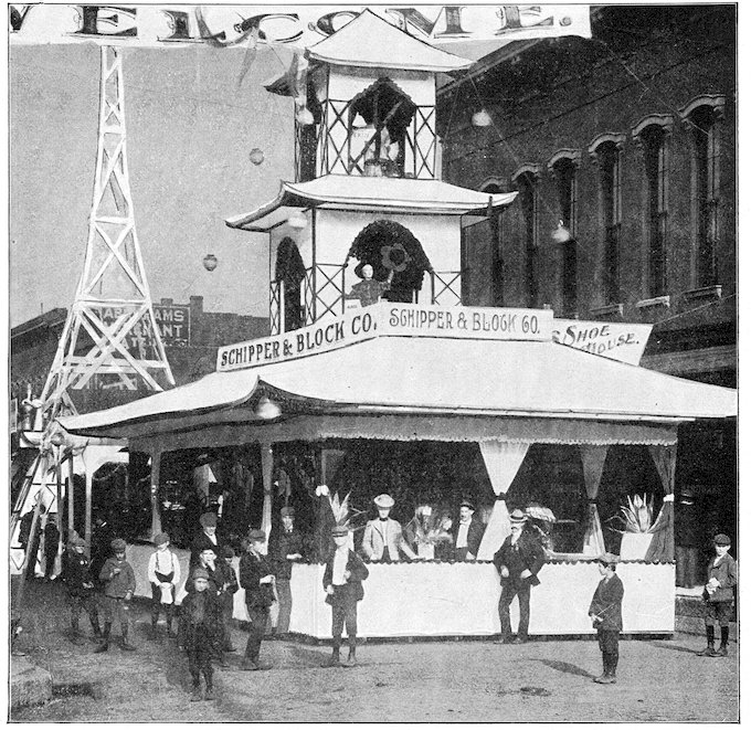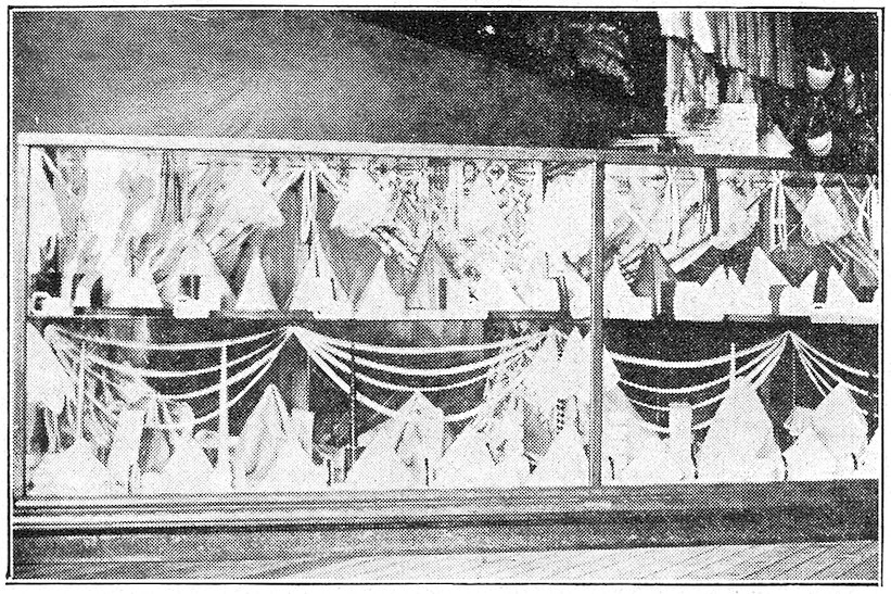 HANDKERCHIEF DISPLAY. FRONT GROUPS ARE UPON POLES, HAVING ELECTRIC LIGHT ON EACH POLE, SURMOUNTED BY WIRE CIRCLE TRIMMED WITH HANDKERCHIEFS.—Cartwright.