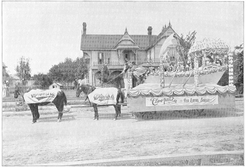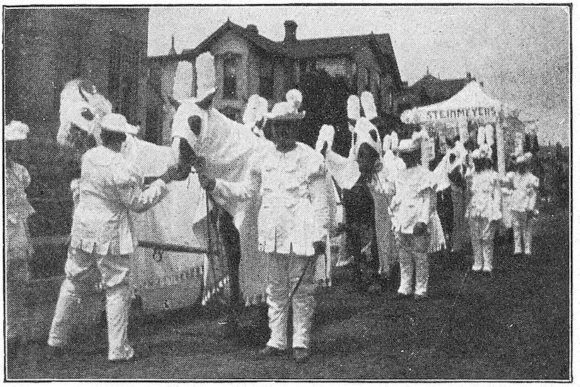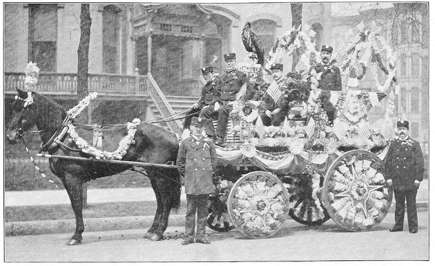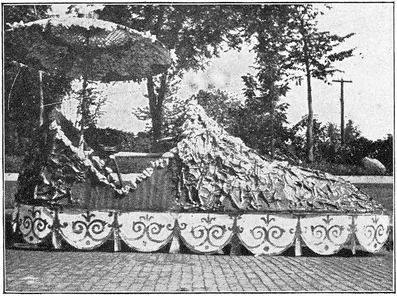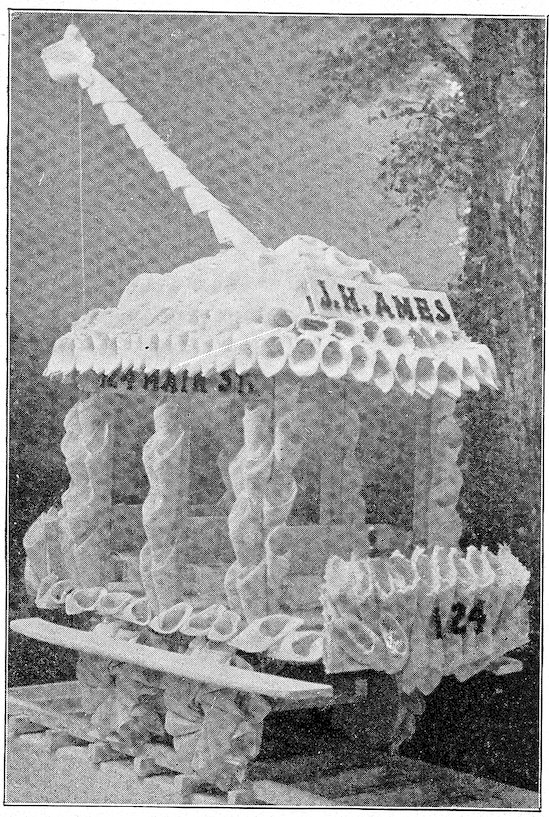 FIRE ENGINE OF LINENS, BUILT OVER LIGHT WOODEN FRAME. HOUSE OF LINENS IN BACKGROUND.—Condit.