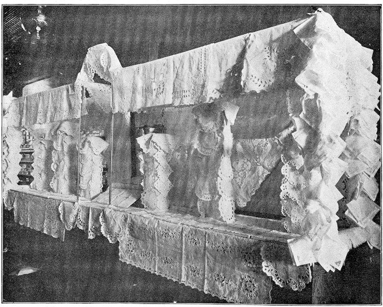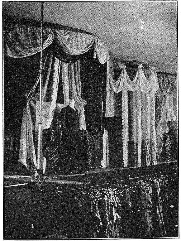 DISPLAY OF LACE CURTAINS HUNG OVER A SUCCESSION OF HORIZONTAL POLES.—Morton.