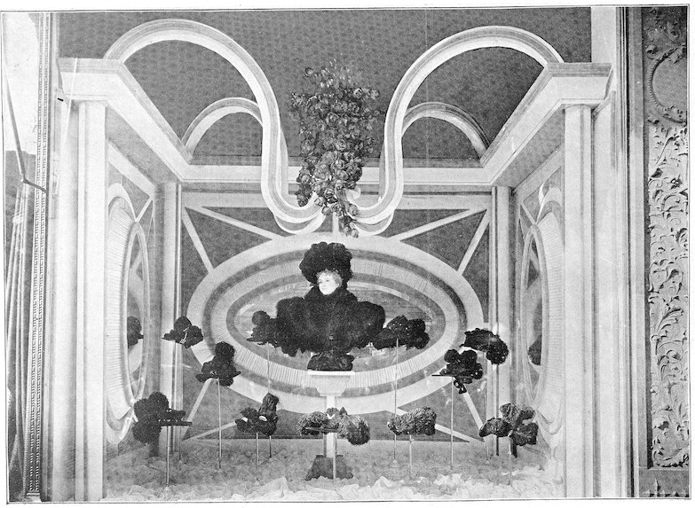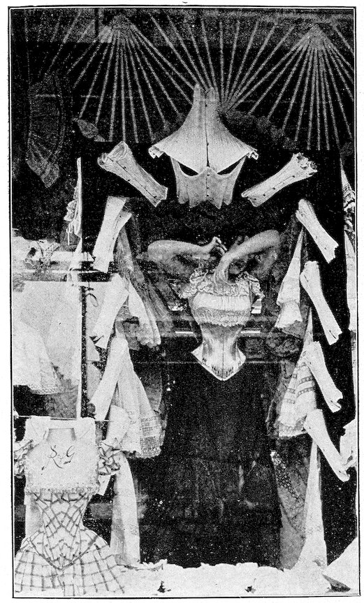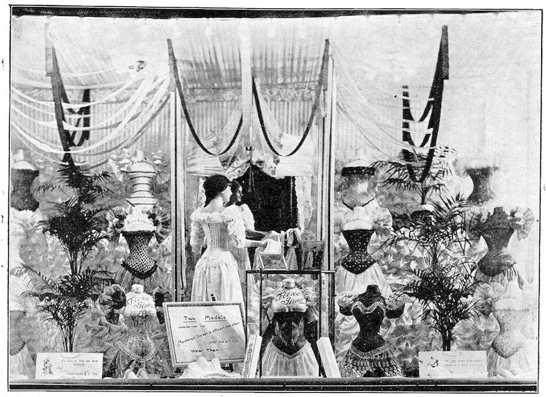 CORSET DISPLAY. SHIRRED PUFFING ON BACKGROUND, SEPARATED INTO PANELS BY RODS COVERED WITH BLACK VELVET.—McFaddin.