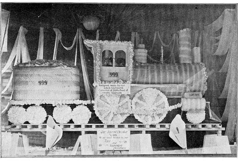 THE SECOND WEEK OF THIS DISPLAY THE LOCOMOTIVE WAS SHOWN IN A WRECKED CONDITION, WITH A CARD ANNOUNCING “WRECKED PRICES.”