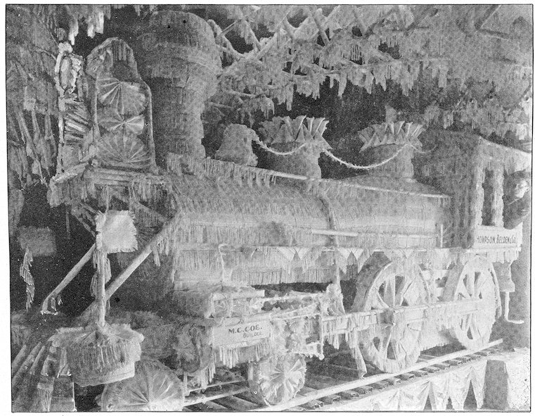 LOCOMOTIVE TRIMMED WITH LACE AND EMBROIDERY, COVERING A THIN WOODEN FRAMEWORK. CAB AND SMOKESTACK OF CARDBOARD.—Pickett.