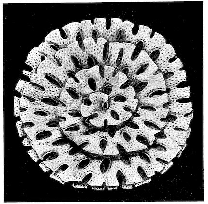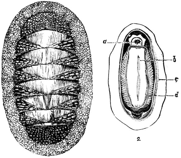 In other genera, as Tethys, Doris, Eolis, &c., the eggs are contained in a spirally rolled ribbon or strap-like structure; and some of the Naticæ build a somewhat similar capsule, composed of the eggs cemented together by sand and a gelatinous material, the whole forming two-thirds of a circle narrowed at the upper part.