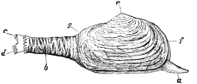 1. Animal: a, foot; b, fringed mantle; c, tentacles; d, mouth; e, eyes; f, gills.