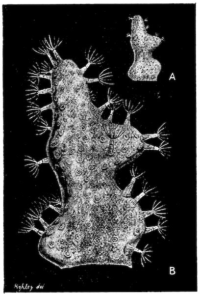 Thread-like processes on either side of the body, the so-called gill-filaments, often unite with those in front of and behind them, and so give rise to plates; these, when well developed, are best seen in the division to which the Oyster and the Mussel belong, and which, therefore, has been called the division of the plate-gilled Molluscs, or Lamellibranchia. Where the body is coiled or twisted on itself, as so often happens, the gills of one side may be altogether lost. Sometimes, as in Phyllirhoë, when the body is small and its wall thin, the gills (ctenidia) disappear altogether, and there is no special breathing-organ; in others the loss of the gill is compensated 3by the formation by the mantle of a lung; this is most often seen in the forms that live on land.