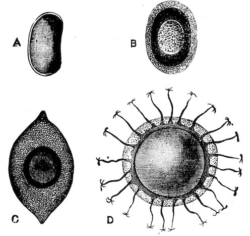 The ova of Mollusca may be gradually developed into the form of the parent, or there may be a free-swimming larva, which has a circlet of cilia near the anterior pole of its body (so-called “Veliger” larvæ), or there may be special larvæ, as in the case of the Freshwater Mussel, the “Glochidium,” as it is called, which has a toothed bivalve shell by which it can fix itself to fishes.