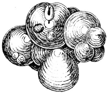 The ova of many molluscs are deposited in masses enclosed in capsules. Some of them are very wonderful and complicated structures. Those of the Cuttles and their allies are clustered like grapes, each capsule containing but a single embryo; but in the Calamaries or Squids they form a radiating mass of elongated sacks, each containing from thirty to two hundred eggs, and it has been estimated that one of the spawn-clusters of the Common Squid (Loligo vulgaris) contains as many as 40,000 ova. Everybody knows the spawn-cases of the Common Whelk, found so abundantly on the sea-beach, consisting of a large number of yellowish capsules, heaped one upon another and forming an irregularly rounded mass. As many as five or six hundred capsules may be piled together in a single heap, each capsule containing several hundred eggs, of which perhaps only thirty or forty are hatched.