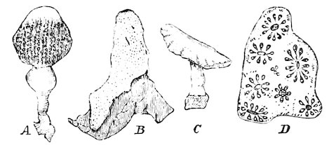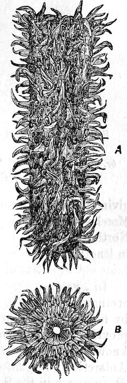 Crinoidea.—This Order may be described as stalked, globular, or cup-shaped Echinoderms, in which the oral surface of the calyx or disk looks upwards, and in which five jointed and generally branched rays arise from the central disk. Their joints have jointed 113pinnules at their sides, and the sucking-feet have the form of tentacles.