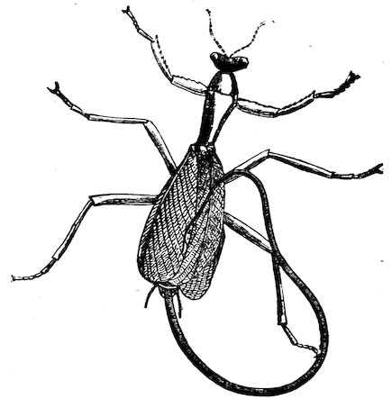 Nematodes (Thread-Worms or Round-Worms).—These are for the most part parasitic, and infest plants as well as animals; the common Round-Worms living parasitically in man (Ascaris, Stronaylus, Trichocephalus) belong to this Order. Sometimes they are parasitic in their early stages and later live a free life—such are Gordius and Mermis. A specimen of a Mantid is exhibited from which half the body of the infesting Gordius has already protruded (Fig. 17). One of the most remarkable Gordii is the great elongated 121G. fulgur, or “Lightning Snake,” from Celebes. Another very large Nematode is the so-called Guinea-worm, or Dracunculus medinensis, which is found beneath the skin of the leg; it is very possible that this worm was the cause of the illness which afflicted the Israelites in their journey through the desert from Egypt to the Promised Land.