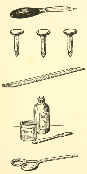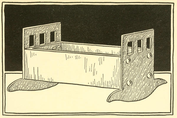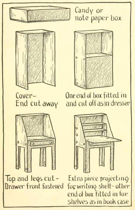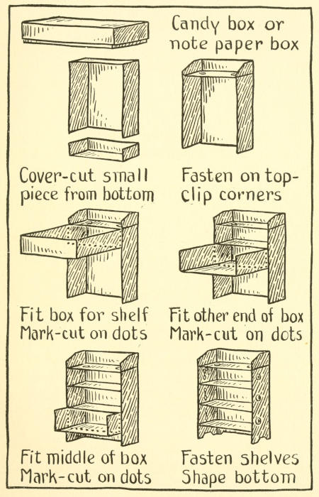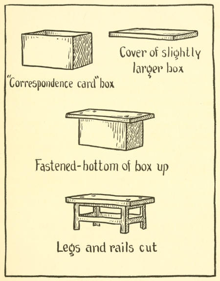 1. Cut a piece of the cover the right height; shape the legs. If you haven’t a box of this kind, a peppermint box and its cover can be used, by cutting off an end of each and fastening them together, as shown in the picture.