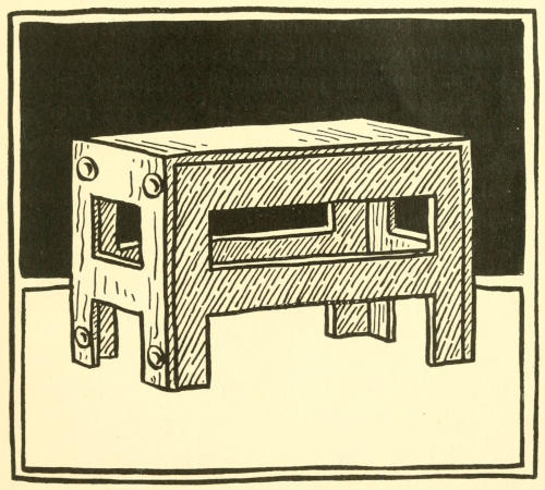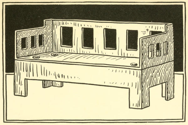 For the bench use a long, narrow and shallow box and its cover. For a small bench use a spool box; for a larger one, a stocking box.
