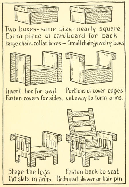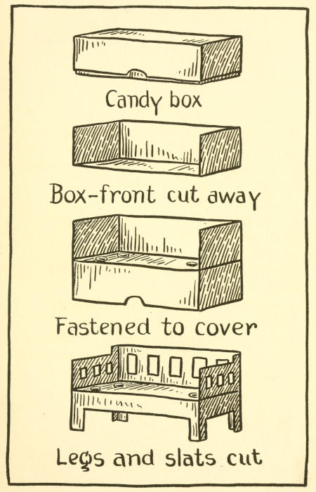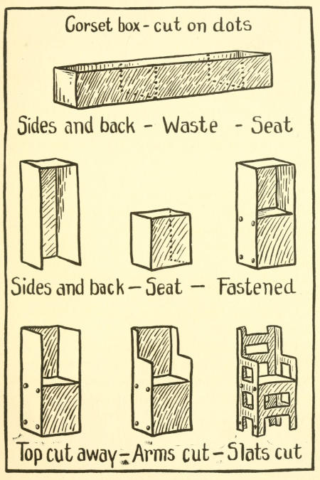 1. Cut seat and back from opposite ends of box as in arm chair. Make the back about 8½ inches and the seat about 5 inches.
