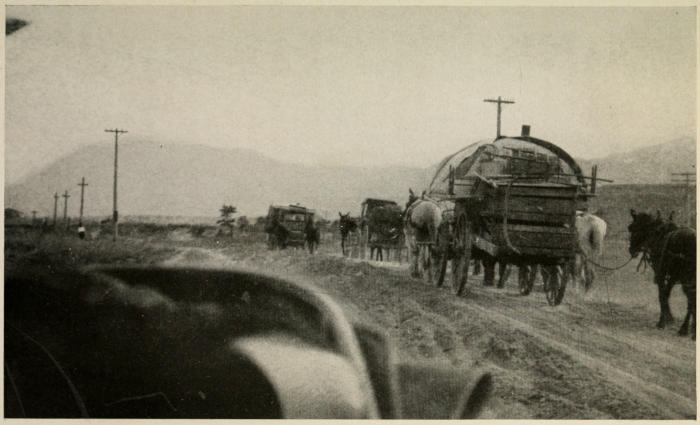 Compared with crossing the plains in the fifties, the[x] worst stretch of our most uninhabited country is today the easiest road imaginable. There are no longer any dangers, any insurmountable difficulties. To the rugged sons of the original pioneers, comments upon “poor roads”—that are perfectly defined and traveled-over highways—or “poor hotels”—where you can get not only a room to yourself, but steam heat, electric light, and generally a private bath—must seem an irritatingly squeamish attitude. “Poor soft weaklings” is probably not far from what they think of people with such a point of view.