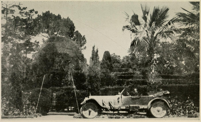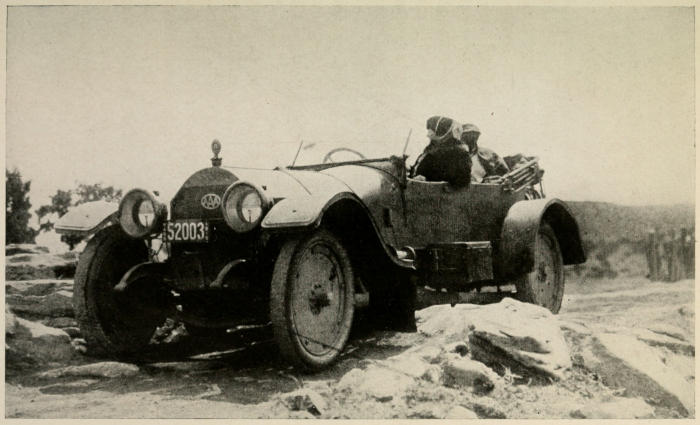 Interpreting “comfort” as really meaning “luxury,” you can go, so far as roads are concerned, only to Pueblo. So far as high-class hotels are concerned, there are two inhospitable distances. The first from Omaha, Nebraska, to Cheyenne, Wyoming; the second between Albuquerque, New Mexico, and Winslow, Arizona, over three hundred miles.[7] Between Ash Fork, Arizona, and Needles, California, the distance is one hundred and ninety-one miles, which over those roads is a long distance, but perfectly possible to make in a day. Also it is by no means necessary to motor across any of these sections, unless you choose to. Putting a machine on a freight train is a very different matter from putting it on a boat and shipping it to Europe. In the latter case, you have to have a crate made as big and clumsy as a small house; then there are always delays and complications about catching boats, and altogether it is something of an ordeal. But to send a motor across[279] our own country, for as short or as long a distance as you please, is very simple. You have only to drive it to the railroad station, roll it on an automobile freight car with a door at the end, as in a small garage, take the next passenger train yourself and skip as many or as few miles as you choose. In America, automobile freight is wonderfully efficient, and is about as fast as ordinary express. (At least the Santa Fé service is.)