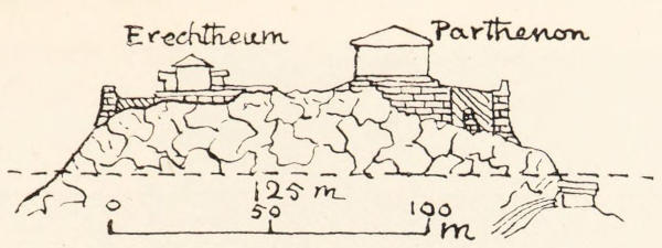 To us to-day the top of the Acropolis appears as a smooth plateau sloping gently westwards towards the Propylaea, and this plateau is surrounded by fortification walls, whose clean, straight lines show them to be artificial. Very similar in all essentials was the appearance presented by the hill to the contemporaries of Thucydides, but such was not the ancient Acropolis. What manner of thing the primitive hill was has been shown by the excavations carried on by the Greek Government from 1885-1889. The excavators, save when they were prevented by the foundations of buildings, have everywhere dug down to the living rock, every handful of the débris exposed has been carefully examined, and nothing more now remains for discovery.
