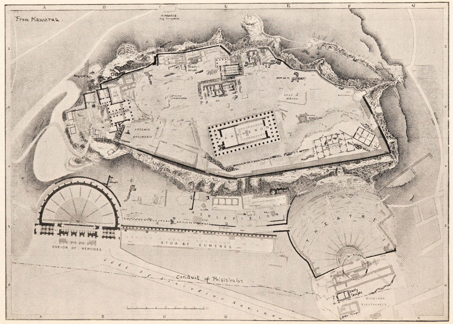 The Acropolis, as in neolithic days the first settlers found it,[11] was, it will be seen in Fig. 1, a long, rocky ridge, broken at intervals[10]. It could only be climbed with ease on the west and south-west sides, the remaining sides being everywhere precipitous, though in places not absolutely inaccessible. For a primitive settlement it was an ideal situation. Two things remained for the settlers to do: first, they had to level the surface by hewing away jagged rocks and filling up cracks with earth and stones to make sites for their houses and their sanctuaries; and second, they had to supplement what nature had already done in the way of fortification; here and there to make the steep rocks steeper, build a wall round their settlement, and, above all, fortify that accessible west and south-west end and build an impregnable gateway. Kleidemos[11], writing in the fifth century B.C., says, ‘they levelled the Acropolis and made the Pelasgicon, which they built round it nine-gated.’ They levelled the surface, they built a wall round it, they furnished the fortification wall with gates. We begin for convenience sake with the wall. In tracing its course the process of levelling is most plainly seen. The question of the gates will be taken last.