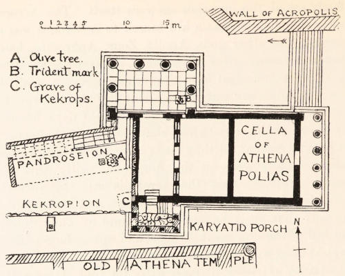 | The sanctuaries of the ‘other deities.’ The later Erechtheion built to enclose a complex of cults. Prof. Dörpfeld’s elucidation of its plan. The hero-tomb of Kekrops. Kekrops and the Kekropidae. The hero-snake. The snakes of the poros pediment of the Hecatompedon. The Pandroseion. Pandrosos. The ‘Maidens.’ The semeia. The sacred olive. The ‘sea.’ The trident-mark. Its primitive significance and connection with Poseidon. Poseidon and Erechtheus. Athena. Herakles. pp. 37-65 | |