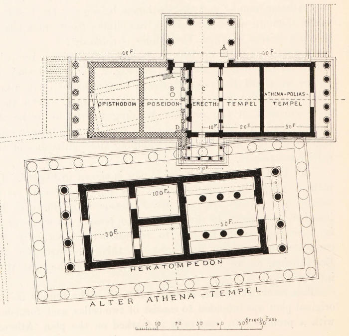 This task—not very easy because alien to my own present work—has been lightened by the help of many friends. Professor Dörpfeld has found time while excavating at Pergamos to go over my proofs and to assure me that his views are correctly represented.[ix] The German Archaeological Institute has generously placed at my disposal the whole of their official publications, from which my illustrations are mainly drawn. The like facilities in the matter of the Acropolis excavations have been kindly accorded me by Dr Kabbadias. Other sources are noted in their place. In the matter of re-drawing, in restorations and the modification of plans I have again to thank Mrs Hugh Stewart for much difficult and delicate work, work which could only be done by one who is archaeologist as well as artist.