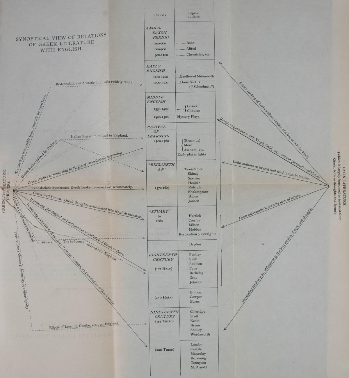 All sound study is comparative. We must place other literatures beside our own, if we desire to appraise rightly our national genius, its capacities, and[2] its creations. We find our English writers composing their works in certain forms, and giving expression to a certain range of ideas. How came they to employ these particular forms of creation? How did they arrive at these particular ideas? How is it with other nations? Have they built upon the same lines and with the same materials, or how is it with them? Have we borrowed from them, or they from us? If there have been borrowings, when and in what measure did they occur? Looking back over the changes of spirit and form which our poetry, for example, has undergone, we shall encourage altogether false notions of the causes of such changes, unless we see how, every now and then, a shower of new ideas, a stream of new light, has come in from abroad. Most readers know in some vague way that Chaucer avows or betrays his debts to France and Italy; that Shakespeare did not invent his own plots, but borrowed from Italians, from Plautus, from Plutarch, and others; that Milton was steeped in the Greek, Latin, and Italian classics. But we want to know more than this. We want to perceive with some definiteness how far the whole course of English literature has been enriched by tributary streams, and what sort of waters they brought. It would be instructive to draw a diagram of our literary history; to liken it to the course of a river, and to picture its various fountain-heads and tributaries pouring in their several quotas at their several times.