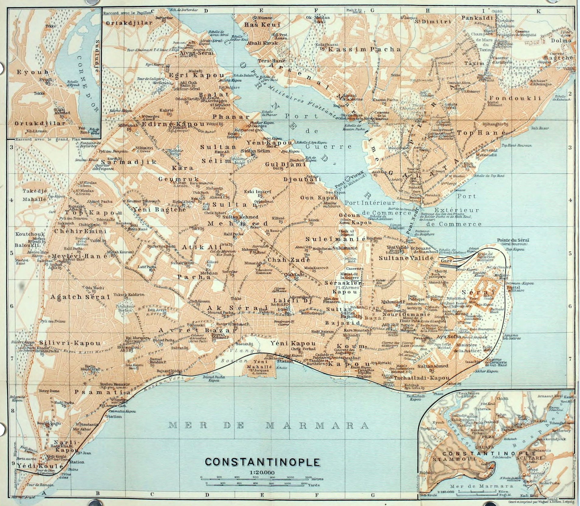 574The chief artery of traffic leads through the Orta Hissar (Pl. A, 1, 2) or older and central part of the castle. It passes (left) the Seraï (Pl. 13; A, 1), the seat of the governor-general, and (right) the mosque of Orta Hissar Jamissi (Pl. 9; A, 1), once the church of Panagia Chrysokephalos, said to have been founded by Justinian.