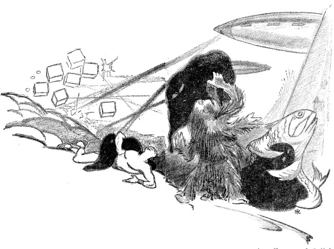 Cubes and cruisers swirled and ran about us as our own cruiser struggled through the wild ruck of the battle, our own black beams stabbing to smash back cubes before and beside us, while through the speech-instruments before me I cried orders to my mighty fleet, directing the masses of cruisers that leapt and struck and soared at the great square cubes about us. All space outside seemed a single giant mass of struggling cubes and cruisers, cut across by blasting crimson bolt and ebon beam, yet ever we were forcing the cube-ships back, back over their ring of revolving disk-worlds, back over their mighty central world, and then down toward it as they fought fiercely against our black beams which drove great paths of destruction through them!