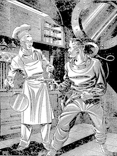 "You was my First Mate," corrected the Old Man coolly, "until just now. The IPS codebook says, 'It is the Captain's privilege to draft any member of crew or command for any duty in times of emergency.' This is an emergency. An' besides, you just got done sayin' that cookin' is simply a matter of exposin' certain hoochamacallits to the action of thingamajigs. So—" He brushed his hairy paws with a gesture of finality, "That's that! To the galley, Mr. Slops!"