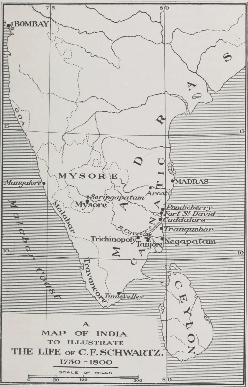 I may add that the quotations in these pages from the letters and journals of Schwartz are chiefly drawn from the original “Remains” published in 1826, and the two volumes of Dean Pearson’s “Memoirs” of 1839, supplemented by a few scattered gleanings from other fields. I should like also to express my indebtedness to the Society for Promoting Christian Knowledge, the Society for the Propagation of the Gospel, the Church Missionary Society, and many literary friends for placing at my disposal books of great service.