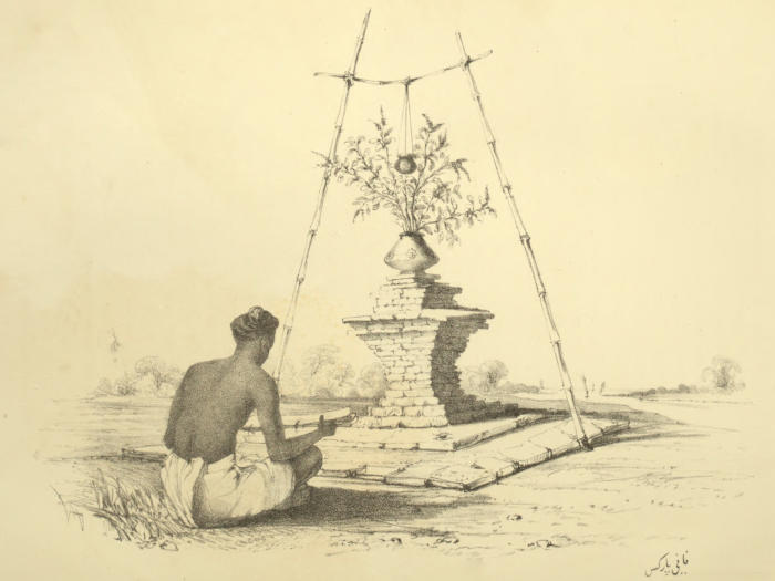 Shivŭ the destroyer, although he paid the compliments necessary on the occasion, ever avoided looking upon the child. The mother naturally reproved him; Shivŭ, annoyed at the rebuke, gazed upon the infant, whose beautiful head instantly withered away beneath a glance which none can endure and live.