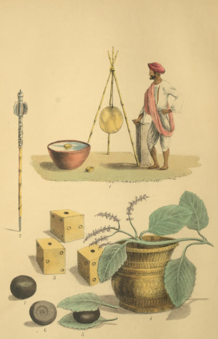 His quadruple hands and arms denote power. In one of his hands is the ānkus, the instrument with which the elephant is guided; in another a battle-axe. Being a child, and therefore fond of sweetmeats, a third hand bears a small cup filled with pera, a sweetmeat common in all bazārs; in the fourth he carries a short rosary, wherewith he counts his beads. Around his neck is twined the Cobra-di-capello, the holy serpent, whose hood is outspread upon his breast. This image is dignified by a frontal eye, signifying the sun, encircled by a crescent, a sol lunar emblem and mystical mark, hence “moon-crowned,” “triple-eyed.” His attendant, a rat, holding a pera, sweetmeat, is placed at his side: on his head is a crown, and around his limbs a yellow dhotī, a cloth of Benares tissue edged with gold. His body is covered with ornaments of rich jewellery, such as are[x] worn by men in the East,—his single tusk is bound with gold,—his hands and feet are dyed with menhdī, hinnā. On each of his four arms are two bāzūbands, or armlets; and chūrīs, or bracelets, of massive gold, adorn his wrists. A golden plate on the back of the hand is fastened round the wrist by chains of gold, and from the upper part similar but finer chains pass over the back of the hand, and unite with rings on all the fingers and the thumb. This ornament is very peculiar; both hands are thus adorned. The chaunrīs above his head, emblems of royalty, are used by the attendant Brahmāns to keep off the flies; they wave them over the head of the idol during pūja.