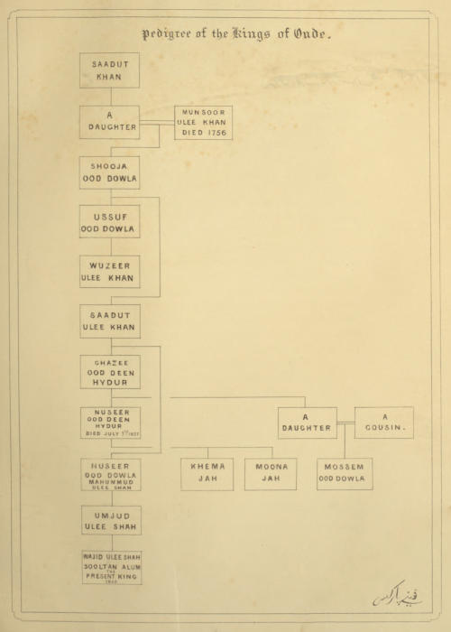 | First Visits in the East—Papamhow—Runjeet Singh’s Illness—Death of Lord Hastings—Lord Amherst created Earl of Arracan—Marriage of a Neem to a Peepul—The Bacäin—A Koord Arab—Visit to Lucnow—His Majesty Nusseer-ood-Deen Hyder—Lord Combermere—Kywan Jab—Presents not allowed to be accepted—Fights of Wild Beasts—Quail—Departure of Lord Combermere—Skinner’s Horse—Return to Prāg | 70 |