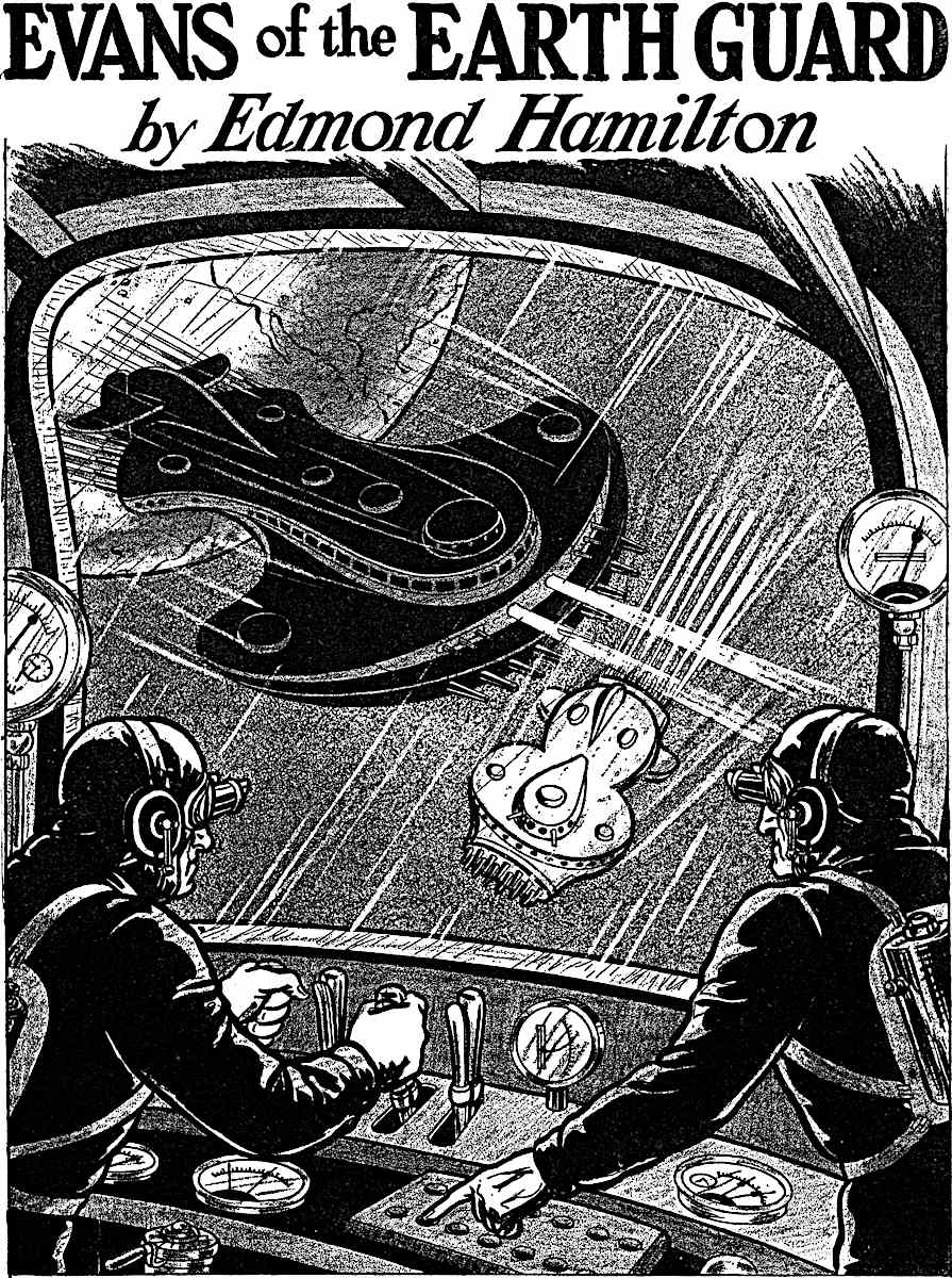 From the squat pilot-house set atop it, Evans and Calden gazed ahead. The great gray disk of earth filled a quarter of the heavens before them, the outline of its continents and seas visible here and there through its shifting screen of clouds. Behind them the moon's silvery sphere was dwindling rapidly, as they had seen it dwindle now for hours. It was hours that the great Earth-Guard rocket with its half-hundred men had been hurtling toward earth after its weary week's vigil in space, before this call had come.