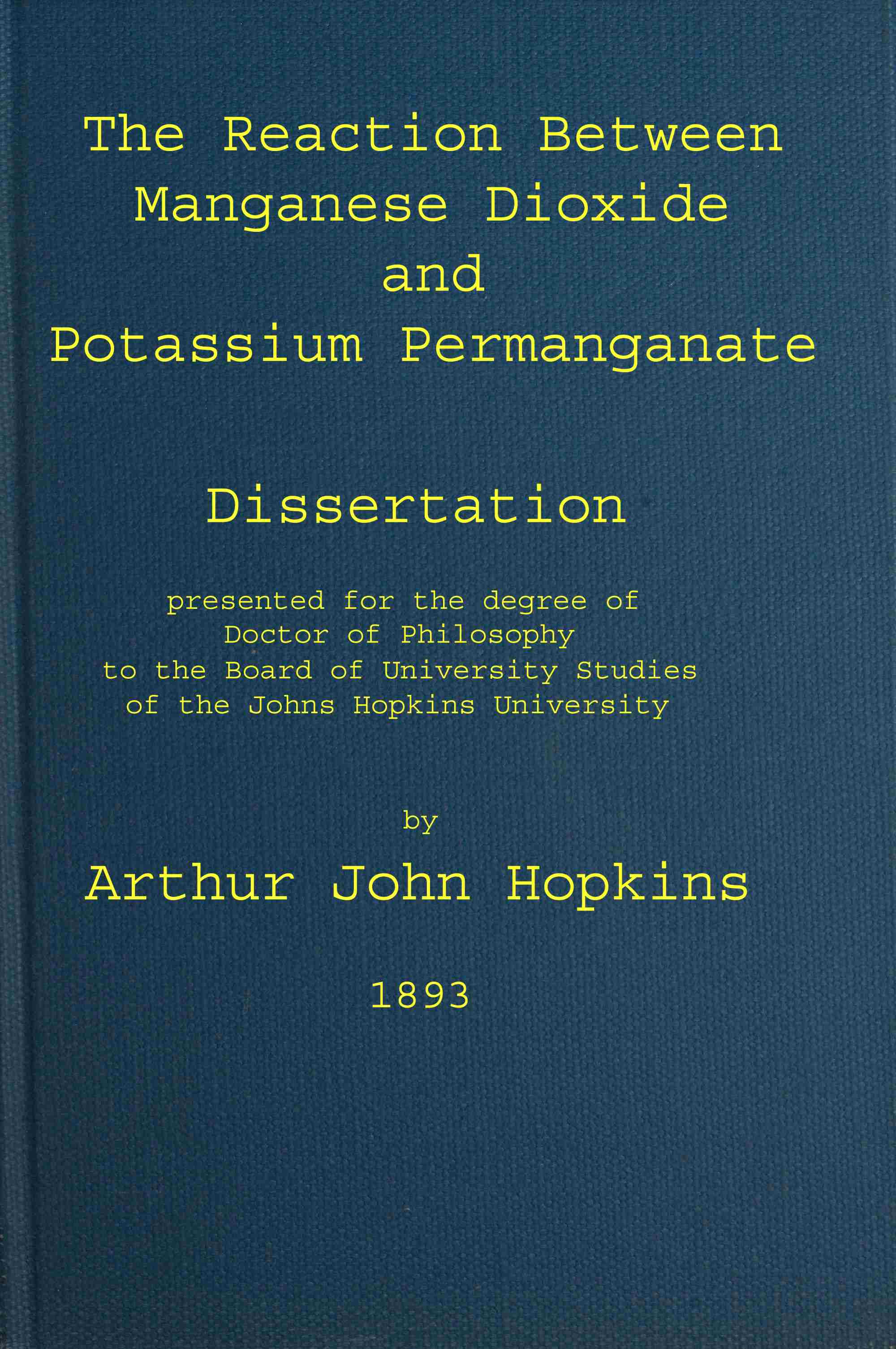 [Pg 4] The reducing action of manganese dioxide upon potassium permanganate was suspected from the observed increase in the rapidity of the decomposition of potassium permanganate solutions. But only a suggestion of such a reaction could be found in the literature. Thénard,[2] in 1856 states that manganese dioxide may act upon potassium permanganate either as a reducing agent, in which act the manganese dioxide is changed to a manganate, or its influence may be catalytic, causing the evolution of oxygen. Again Mulder[3] in 1858, ascribed the decomposition of potassium permanganate solutions to the presence of some potassium manganate.