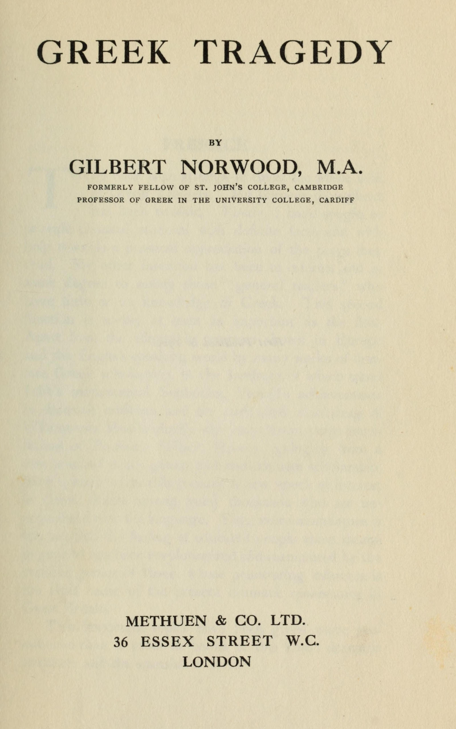 This book is an attempt to cover the whole field of Greek Tragedy. My purpose throughout has been twofold. Firstly, I have sought to provide classical students with definite facts and with help towards a personal appreciation of the plays they read. My other intention has been to interest and in some degree to satisfy those “general readers” who have little or no knowledge of Greek. This second function is to-day at least as important as the first. Apart from the admirable progress shown in Europe and the English-speaking world by many works of first-rate Greek scholarship, in the forefront of which stand Jebb’s monumental Sophocles, Verrall’s achievements in dramatic criticism, and the unrivalled Einleitung of Wilamowitz-Moellendorff,—the magnificent verse-translations of Professor Gilbert Murray, springing from a rare union of poetic genius with consummate scholarship, have introduced in this country a new epoch of interest in Greek drama among many thousands who are unacquainted with the language. Even more momentous is the fact that the feeling of educated people about drama in general has been revolutionized and reanimated by the creative genius of Ibsen, whose penetrating influence is the chief cause of the present dramatic renaissance in Great Britain.