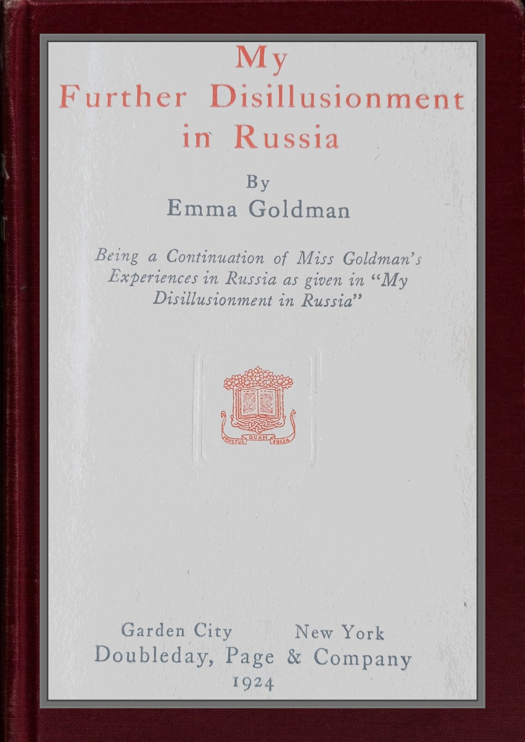 My manuscript was sent to the original purchaser in two parts, at different times. Subsequently the publishing house of Doubleday, Page & Co. bought the rights to my work, but when the first printed copies reached me I discovered to my dismay that not only had my original title, “My Two Years in Russia,” been changed to “My Disillusionment in Russia,” but that the last twelve chapters were entirely missing, including my Afterword which is, at least to myself, the most vital part.{viii}