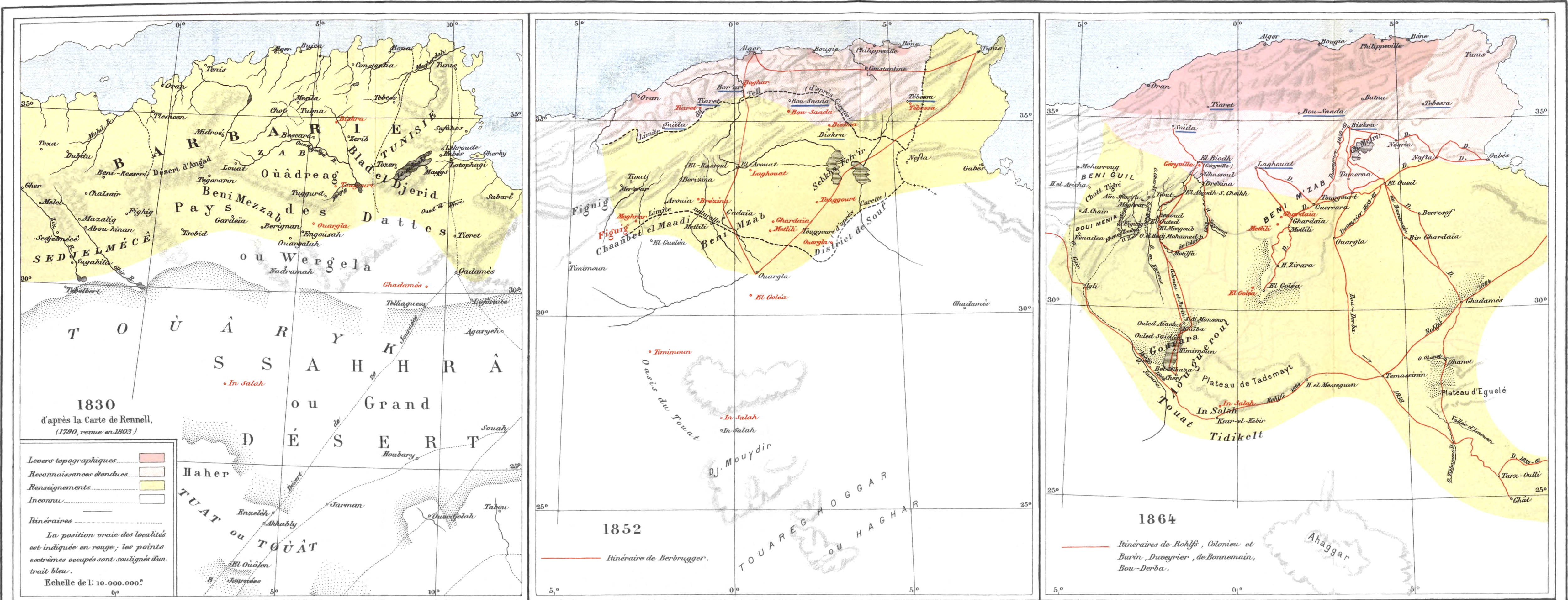 Parmi les renseignements dont on disposait, les uns remontaient à une époque antérieure à 1830. Les auteurs principaux auxquels on les empruntait étaient, outre les géographes grecs et romains, El-Bekri (XIe siècle)[4], Edrisi (XIIe siècle)[5], Léon l’Africain (XVIe siècle)[6], Thomas Shaw (XVIIe siècle)[7], enfin les naturalistes français Peyssonnel,[3] Desfontaines[8] et Poiret (XVIIIe siècle)[9]. Le major Laing (1825-1826), puis René Caillié (1827-1828) avaient visité Tombouctou, mais leurs traversées du Sahara avaient fourni peu de résultats scientifiques. La carte d’Afrique publiée par Rennel en 1790 (revue en 1803), dont nous reproduisons la partie relative au Sahara, peut être considérée comme représentant assez exactement l’état des connaissances avant la conquête française. La carte publiée par le colonel Lapie (1828)[10], appuyée surtout sur Shaw, ne marque pas un progrès bien sensible sur la carte de Rennel, bien que Carette ait dit « qu’il était impossible de faire un usage plus judicieux de matériaux incohérents[11] ».