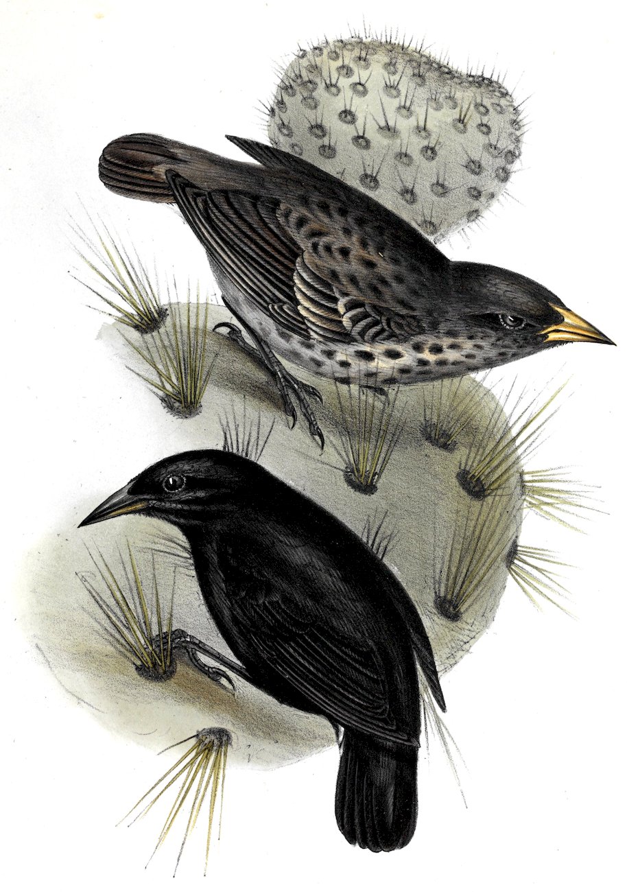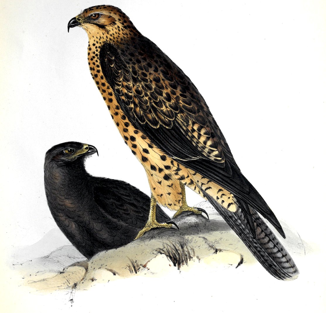 25This bird is, I believe, confined to the Galapagos Archipelago, where on all the islands, it is excessively numerous. It inhabits, indifferently, either the dry sterile region near the coast, which, perhaps, is its most general resort, or the damp and wooded summits of the volcanic hills. This bird, in most of its habits and disposition, resembles the Milvago leucurus, or the Falco Novæ Zelandiæ of older authors. It is extremely tame, and frequents the neighbourhood of any building inhabited by man. When a tortoise is killed even in the midst of the woods, these birds immediately congregate in great numbers, and remain either seated on the ground, or on the branches of the stunted trees, patiently waiting to devour the intestines, and to pick the carapace clean, after the meat has been cut away. These birds will eat all kinds of offal thrown from the houses, and dead fish and marine productions cast up by the sea. They are said to kill young doves, and even chickens; and are very destructive to the little tortoises, as soon as they break through the shell. In these respects this bird shows its alliance with the buzzards. Its flight is neither elegant nor swift. On the ground it is able, like the M. leucurus and Phalcobænus montanus of D’Orbigny, to run very quickly. This habit which, as before observed, is so anomalous in the Falcons, manifests in a very striking manner the relation of this new genus with the Polyborinæ. It is, also, a noisy bird, and utters many different cries, one of which was so very like the shrill gentle scream of the M. chimango, that the officers of the “Beagle” generally called it either by this name, or from its larger size by that of Carrancha,—both names, however, plainly indicating its close and evident relationship with the birds of that family. The craw is feathered; and does not, I believe, protrude like that of the P. Brasiliensis or M. leucurus. It builds in trees, and the female was just beginning to lay in October. The bird of which the full figure has been given, is a young female, but of, at least, one year old. The old male bird is of a uniform dusky plumage, and is seen behind. The adult female resembles the young of the same sex, but the breast is dark brown like that of the male. In precisely the same manner as was remarked in the case of the M. leucurus, these old females are present in singularly few proportional numbers. One day at James’ Island, out of thirty birds, which I counted standing within a hundred yards of the tents, under which we were bivouacked, there was not a single one with the dark brown breast. From this circumstance I am led to conclude that the females of this species (as with the M. leucurus) acquire their full plumage late in life.