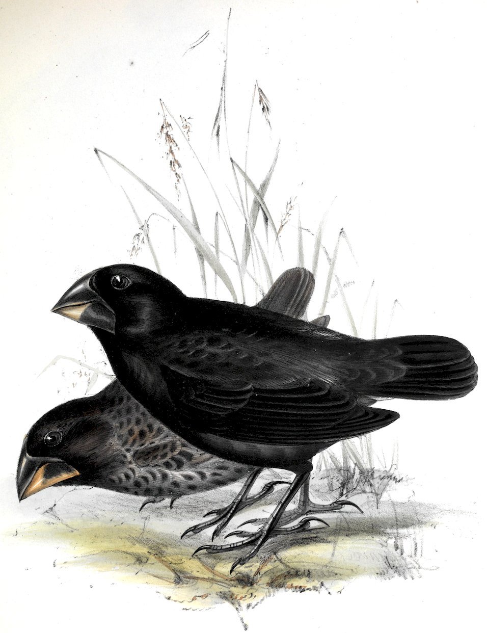 16The plumage in the two sexes of this species differs in a manner unusual in the family to which it belongs. The description given in all systematic works is applicable, as I ascertained by dissection, only to the old females; namely, back and breast black, with the feathers of the neck having a white central mark following the shaft,—tectrices, with a broad white band at extremity; thighs and part of the belly rufous-red; beak “ash gray,” with cere and tarsi “Dutch orange.”