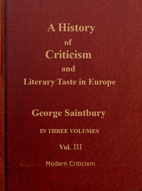 In the first volume of this History we had to summarise the critical work of nearly two thousand years; in the second, that of two whole centuries, with the major part of that of the third. In this we have had the apparently more manageable task of considering the whole work of the nineteenth century only, with the remanets (left over, not by accident but design) from the eighteenth and earlier. Yet it would be a poor compliment to the reader’s intelligence to waste time in explaining to him that the weight of the task is very little lightened by the lessened number of the years with which we have to deal. And the actual congestion of the volume ought all the less to be increased by repetition of things already said in former Prefaces, or by single-stick play with reviewers. Some points, which seemed to be really worth handling, I have dealt with in the text; the others I must let alone. I have little fear that many impartial and competent critics will dispute my claim to have surveyed the matter with the actual documents in hand, and not (save in the rare cases specified) from comments and go-betweens, from abstracts and translations; while such critics may even grant my “mass,” as some indeed have in their kindness granted it already, a fair share of “agitating mind,” under the conditions and with the limitations specified in the original preface. I may at least hope that I shall not be charged with