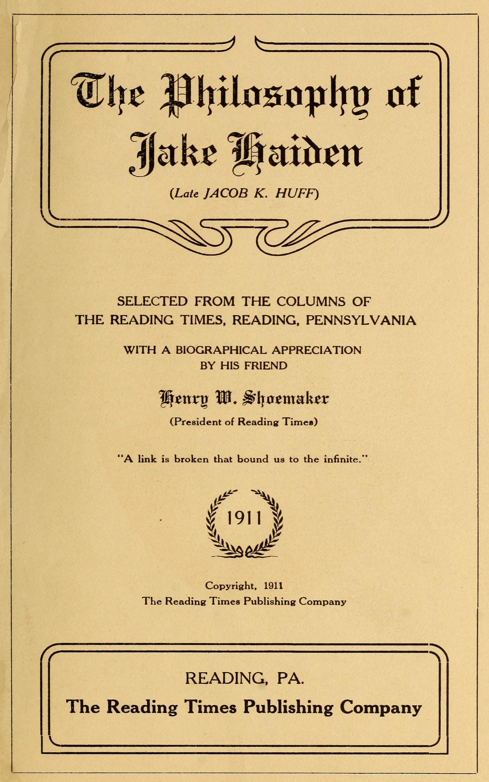 One son, Myron Reed Huff, named after the great liberal preacher, Myron Reed, whom Jacob warmly admired, was born on June 22, 1895, to bless the union. This boy, who is a happy blend of his talented parents, is himself an artist and author, and now contributes articles to the Reading Times under the name of Jake Haiden, Jr. And now comes the story of his connection with the Reading Times, the last important event of his life, in whose service he was at the time of his untimely demise. Early in May, 1908, the writer of this article received an autograph copy of “Songs from the Desert,” and it quickened the desire, which he later learned was mutual, to meet the famous philosopher. At McElhattan on Memorial Day, of that year, he waded across a muddy road in front of the home of a mutual friend, Mrs. Anna S. Stabley, since deceased, and shook the hand of “Faraway Moses,” Jacob Huff. A long conversation ensued, and they became warm friends. The writer at that time was President of the Daily Record, at Bradford, Pa., and soon after his new associate began contributing short articles of timely interest to that paper. In September of that year, he assumed the same position with the Times, of Reading, and with the first issue under the new management began the celebrated “Jake Haiden” articles. They were instantly successful, and their appeal to all classes, their liberality, their toleration, their humanity, their pathos, made them noted and quoted all over the State. It is pleasant to recollect that Jacob Huff paid several visits to Reading while contributing to the Times. He was there on New Year’s Eve, 1909, and for New Year’s Day prepared an exceptionally strong editorial, for he also wrote many editorials, called simply “1910,” which attracted widespread attention. His last visit was late in January, 1910, when the management of the Times entertained him as guest of honor at a dinner at the Wyomissing Club. The guests included the Times staff, the publishers of the Reading Telegram, Capt. Henry D. and Herbert R. Green, who were always appreciative of his work, John D. Mishler, and others of equal note. There were after dinner speeches of a brief character, and the guest of honor closed the evening with a few remarks which seemed to come directly from his heart. With the early summer, the Times[viii] conceived the idea of sending “The Reading Times Philosopher,” as he was becoming generally known, to the far west in order to gain fresh impression for his powerful articles. Accompanied by his loving wife and son, and a close friend Prof. Betts, he started away gaily. From letters and postcards he must have enjoyed himself, and his note-book shows he had jotted down ideas for five hundred and fifty new articles or editorials. The party returned to Chatham Run on July 20, where the philosopher maintained a comfortable home, and on the night of July 31, 1910, he was seized with heart failure and died a few hours later. Prompt medical aid from Dr. Joseph M. Corson, his friend and neighbor, was of no avail, and the giant intellect and friendly spirit returned to its original source. His funeral was the occasion of a tremendous outpouring of people, interment being made at Jersey Shore. The press of the entire State echoed the grief of his relatives and friends and the great loss to the literary world. The religious beliefs of such a man are always interesting. His can be summed up in the final sentence of the little speech he delivered at Reading, “We look around and in everything we see God.” It was the religion of humanity, the creed of helpfulness and good cheer. He lived up to the letter of his faith, for when he died he left a host of friends and no enemies. He had steered his bark through the perilous waters of life without hurting anyone, or sullying himself. It was a beautiful life, but to those who knew him comes the ever recurring regret “Why could not he have been spared a few years longer?” There was so much to do, the world was crying for his help. Maybe the publication of this book containing some of his most characteristic opinions will give renewed energy to his disciples and send them into the thickest of the fight for the betterment of mankind. If he had a motto it must have been “I want to leave the world a little brighter, a little better, a little happier than when I came in it.” Who knows, to what extent he succeeded! Time alone will measure the fulness of his fame, but he should rank as a nature lover with Henry D. Thoreau, as a humanitarian with Theodore Parker, and as a poet with Eugene Field.