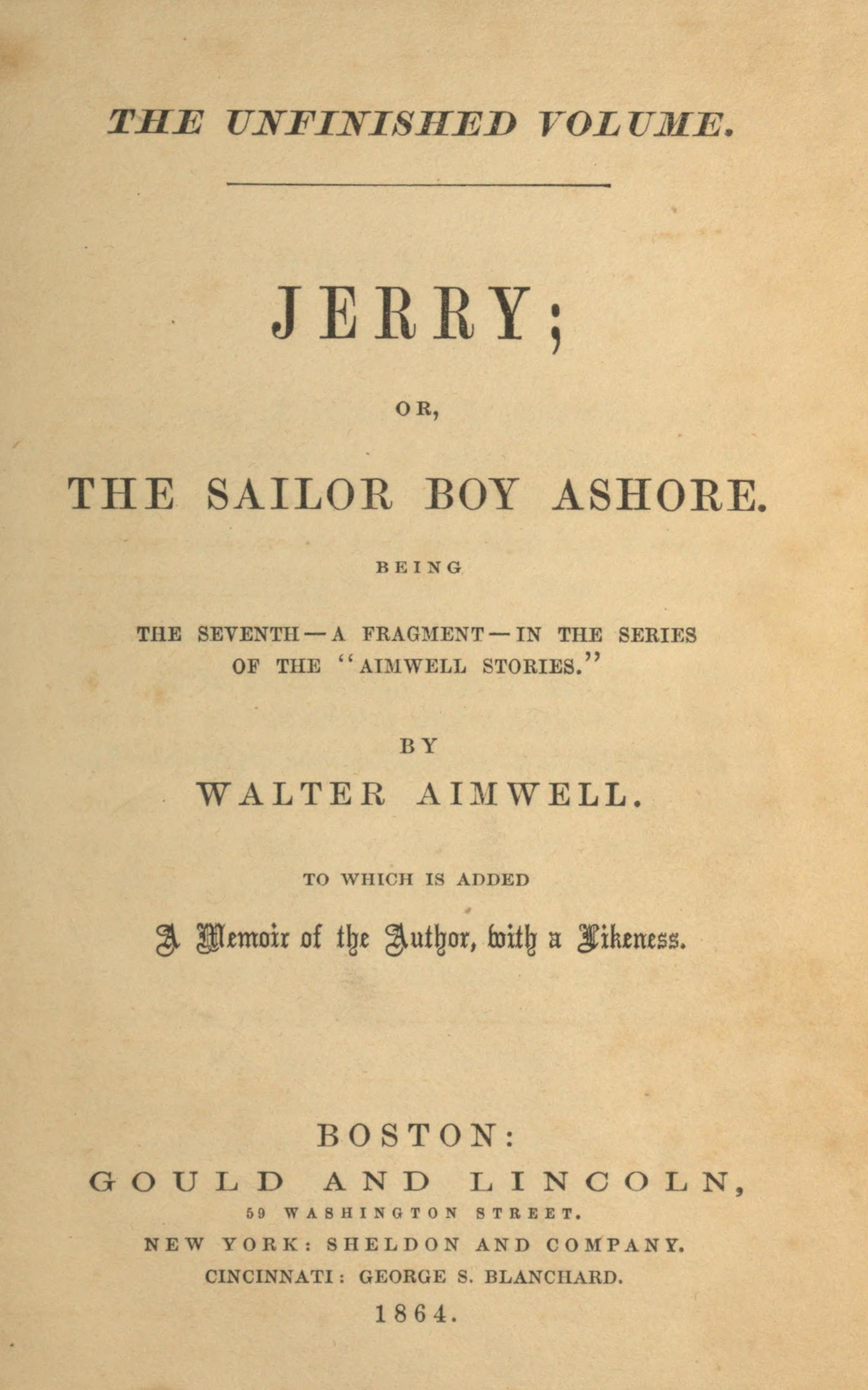 The story of Jerry, while possessing not the entire completeness of other volumes of the series, owing to the lamented death of the author before he had finished the work, will be found wanting in none of those attractions which have secured for the “Aimwell Stories” their great popularity. Its design is to show the folly of restiveness under parental restraint, and the blighting influence upon character of vicious or low associates; and thus to incite the young reader to the prompt performance of filial duty, and to cherish those high aims which are the basis of manly character. Jerry’s own story of his adventures will be found to contain much useful information pertaining to sailor life, and to the portions of the world which he visited; while the whole work, like its predecessors, has been written with our motto in mind, “Precepts may lead, but examples draw.”