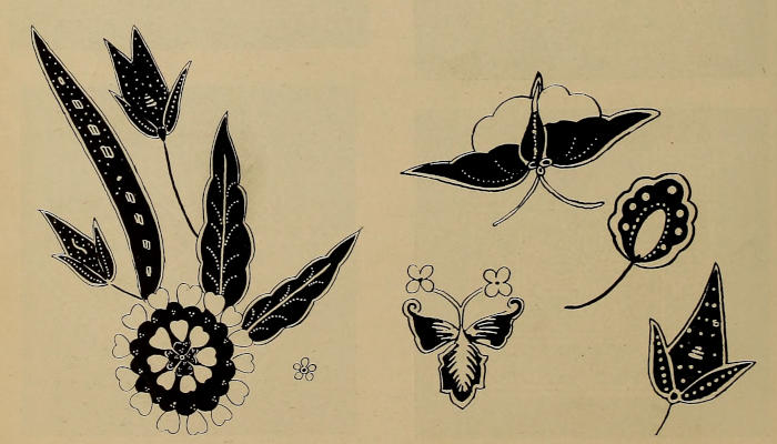 The more we study the designs of the Javanese the more we realize the influence of their tools. The dots on leaves and flowers, the use of the light outline, the kind of line, the beautiful line designs used—all have been worked out with this characteristic tool and in certain ways are suggested by it.