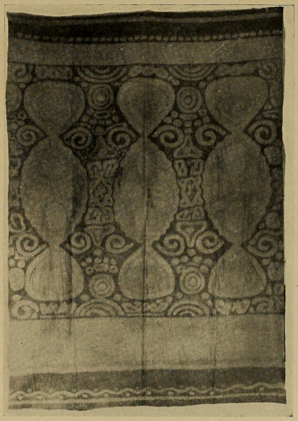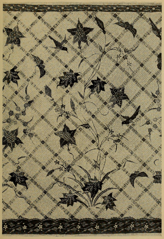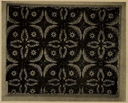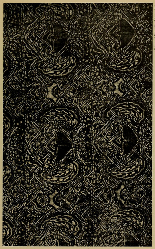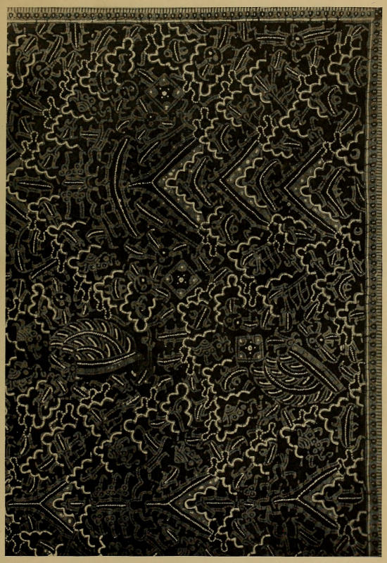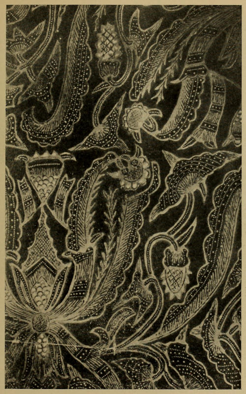 This process of wax painting, however, reached its highest development in Java, where it was probably introduced about the twelfth century. The earliest written record we have states that in 1518, there was a flourishing industry of this sort at Cheribon, Java, which showed certain remarkable resemblances to the processes employed on the Coromandel coast of southern India. The work was done by men, and plant and animal motives were largely used in the designs. At that time, that portion of the island had not yet been Mohammedanized, as we see by the designs used.