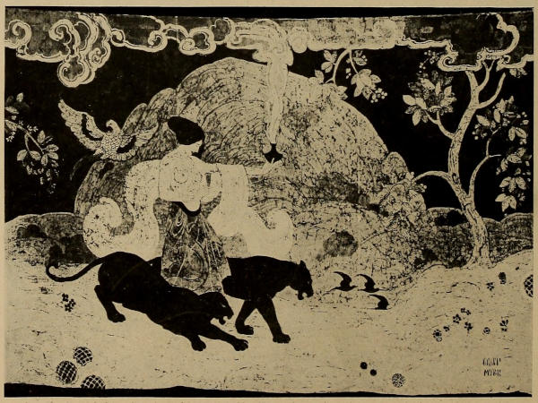 Specimens of Batik work were carried to Holland during the seventeenth century by the Dutch East India Company as one of the interesting products of Java. The work was neither understood nor appreciated at that time, and the lack of appreciation discouraged any further importation. Somewhat later the Dutch artists, Chris Lebeau, Eachet and Dysselhof, appreciating the beauties of this craft, studied it themselves. By their exquisite work they aroused an interest among artists. From Holland the craft spread to France, and to the alert artists of these countries we owe the increased appreciation. The work done in Europe has been applied to interior decorations rather than to costumes. This side has been left to the American designer and artist. The costumes illustrated in this volume are beautiful examples of costume designing in its broadest sense.