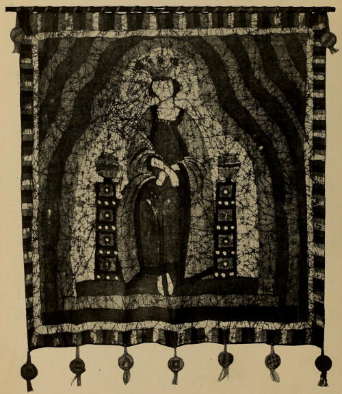 While “Batik” offers large opportunities for home workers, it also presents an interesting field for industrial art problems for students in art schools, high schools, normal schools, and colleges. Many progressive art teachers are offering courses in “Dyes and Dyeing” in connection with their scientific study of “Color,” and relating them also to the work in “Costume Design,” “Interior Decoration,” and “Domestic Art.”