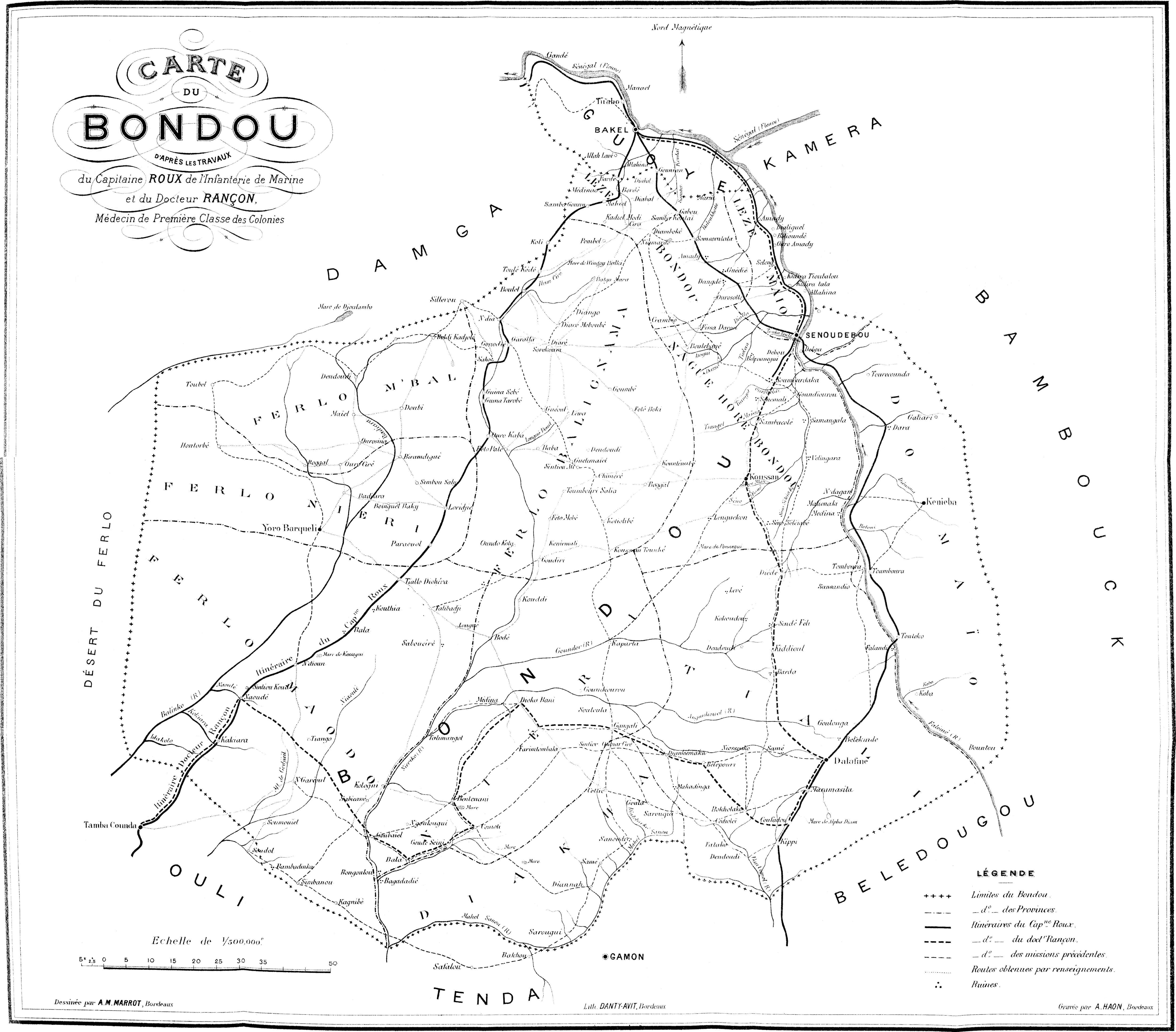 Il en est bien moins encore qui connaissent l’empire sur lequel il régna. Jusqu’à ce jour, on n’a pu recueillir sur sa géographie et son histoire que des données absolument incomplètes et le nom de Bondou sous lequel on le désigne n’éveille guère dans l’esprit de la grande majorité du public qu’une image bien vague et bien incertaine de paysages tropicaux, de brillants horizons et de sombres villages brûlés par un soleil ardent, au milieu desquels errent de leur pas mélancolique et grave de noirs adeptes de la religion du prophète.