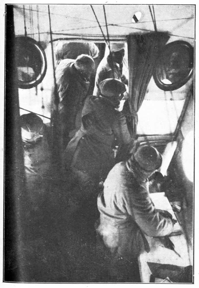 Pendant notre vol du Spitsberg à l’Alaska, le poste à grande puissance de Stavanger (L. C. M.) dans la Norvège méridionale nous envoya de nombreuses informations empruntées aux émissions météorologiques faites par les divers pays d’Europe et de l’Amérique du Nord et un signal horaire spécial deux fois par jour, à 6 heures et à 18 heures (temps moyen de Greenwich). En outre des appareils émetteurs et récepteurs, le Norge était muni d’un dispositif goniométrique système Marconi avec deux grands cadres fixes et un radiogoniomètre. Ce radiogoniomètre était construit pour une longueur d’onde de 600 à 18.000 mètres, de telle sorte que l’on pût prendre des relèvements non seulement sur les postes côtiers, mais encore sur les stations radiotélégraphiques à grande puissance en cas de besoin. Ces relèvements ont été très utiles à notre navigateur. Les appareils indiquaient les directions avec une erreur de seulement 1°, mais les brusques mouvements du dirigeable, la paresse des compas, permettaient difficilement d’exécuter les relèvements avec précision.