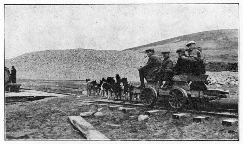 « Fort obligeamment la compagnie de Ny Aalesund a mis à ma disposition trois poneys ; avec un train d’équipages aussi faible le transport de ces énormes monceaux de matériaux exigerait des semaines. En conséquence, je décide de prolonger la voie de desserte du quai jusqu’au site du hall : c’est 400 mètres de rails à poser. Ce travail achevé, on recommence à manutentionner tous ces bois pour les charger sur les wagonnets et les conduire au chantier. Une rude besogne, en vérité ! Heureusement, le temps se maintint au beau, mais quel froid !