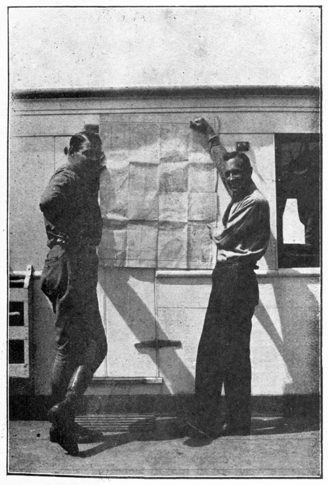 Pour le même motif l’ombre ne peut servir à la mesure directe de la vitesse. Quand ce procédé est possible, voici comment on opère : on note sur un compteur l’intervalle de temps entre le passage de l’avant de l’ombre et celui de l’arrière sur un point choisi à l’avance. Pendant cet intervalle, le ballon a parcouru une distance égale à sa propre longueur. Je me servis de cette méthode pour vérifier les résultats fournis par le Goerz ; mais c’était un contrôle sujet à caution. Lorsque les contours de l’ombre ne sont pas nets, sa longueur ne correspond pas à celle du ballon. Dans ce cas, la valeur de la vitesse est trop forte. Les résultats obtenus par ces deux méthodes concordant assez bien, je les crus exacts et les utilisai pour l’estime. Mais je reconnus bientôt qu’ils étaient beaucoup trop élevés : les valeurs données par la méthode de l’ombre parce que les contours n’étaient pas nets, celles fournies par l’instrument parce que la pression barométrique avait varié. Chaque fois que j’observai une latitude, j’éprouvai une déception ; elle indiquait, en effet, que nous n’avions pas autant progressé que nous le pensions d’après les mesures de vitesse.